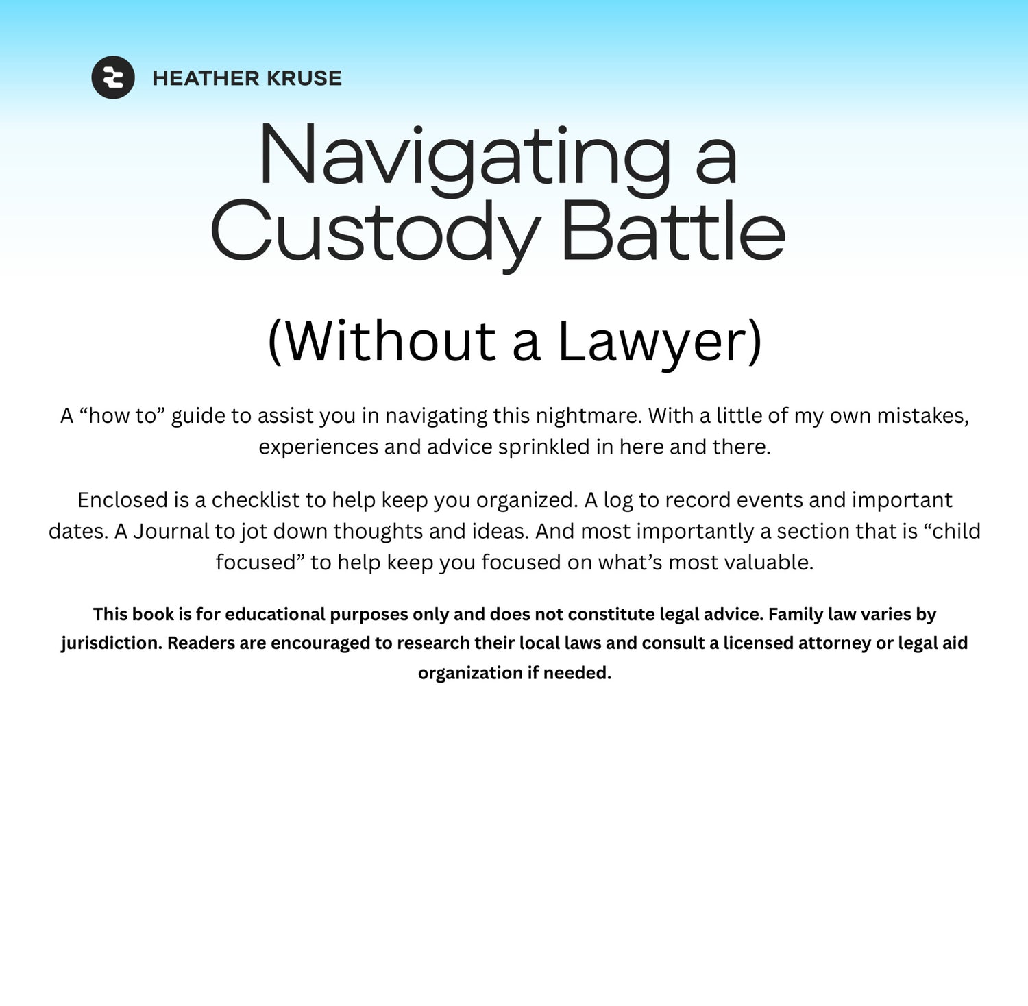Are you going through a Custody Battle? Can't afford a Lawyer? Do you need help navigating your case pro-se? This downloadable PDF offers all the tips you'll need. Includes a journal, checklist, and child-focused documentation section to keep you organized and sane. Mistakes and experiences I made during the custody process to give you piece of mind that no parent is perfect but should be awarded the same day in court as the high priced lawyers. The PDF is automatically emailed to you upon purchase.